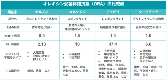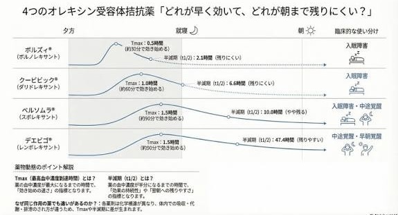 近年、安全性の高いオレキシン受容体拮抗薬の不眠タイプ別(多様)な新薬が次々と登場しています。