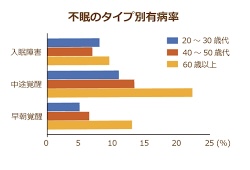 不眠症には、入眠困難(寝つけない)、中途覚醒(途中で目が覚める)、早朝覚醒(早朝に目が覚める)の3つのタイプが存在します。実際にタイプ別の有病率を見てみると、どのタイプも加齢とともに増加しています。