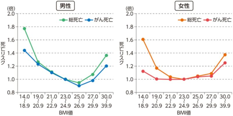 日本人の40歳以上の男性16万人、女性19万人のデータを平均12.5年追跡し、BMI値(体格指数)が総死亡リスク、がん死亡リスクに与える影響を推定されています。がんによる死亡リスクは太りすぎでもやせすぎでも高くなっています。