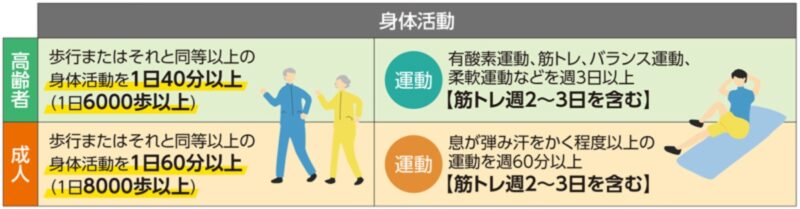 運動にあたっては、厚生労働省が推奨している身体活動量の指針も目安となります。