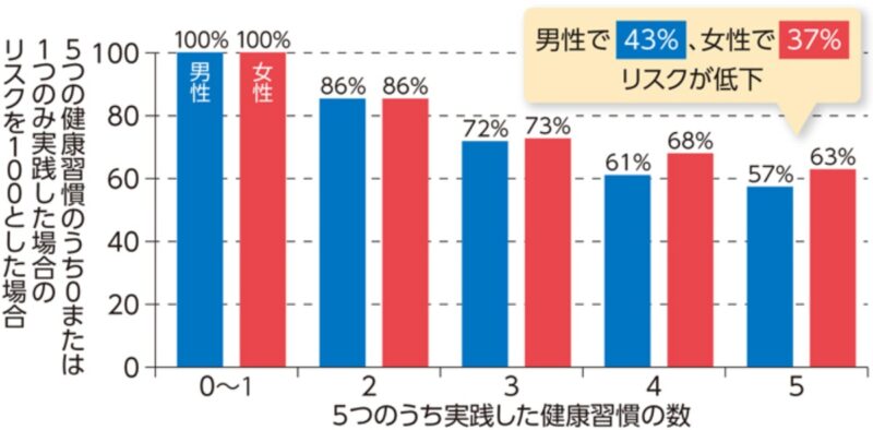 40歳から69歳の男女約14万人を対象に、生活習慣とがんや他の病期の罹患について追跡調査が実施されています。その結果、5つの健康習慣を実践する人は、0または1つのみ実践する人と比較して、男性で43%、女性で37%、がんになるリスクが低下しています。