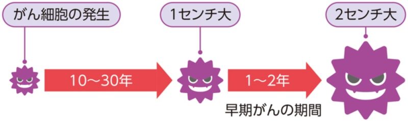 免疫細胞による監視をすり抜けたがん細胞は、10~30年という長い時間をかけて、一般的な画像検査で発見可能な1センチ大にまで成長します(図1)。