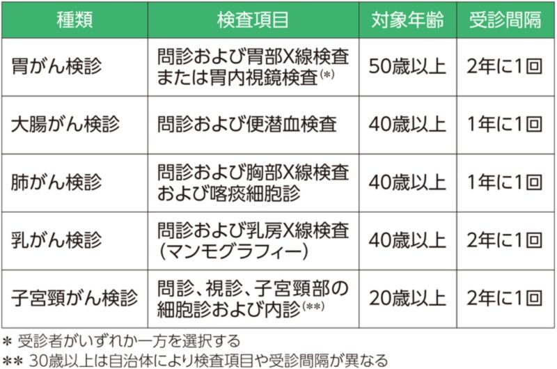 厚生労働省は健康増進法に基づき、市町村による住民検診で、胃がん、大腸がん、肺がん、乳がん、子宮頸がんの5つの検診を行うことを定めています(図2)。企業に勤めている場合、職場の健康診断にこのがん検診が含まれていることもあります。