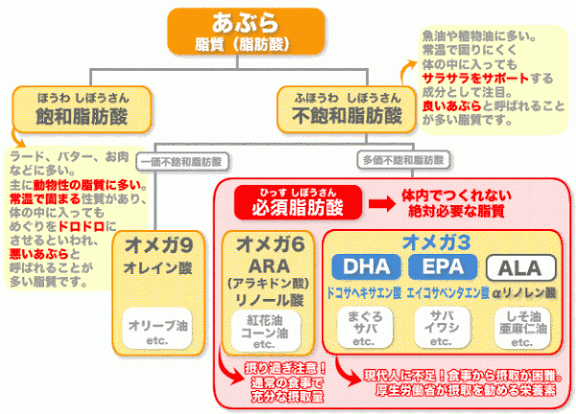 「不飽和脂肪酸」は植物系や魚類に多く含まれる健康に良い油で、悪玉(LDL)コレステロールの抑制や、体内で合成できない「必須脂肪酸」として健康維持に重要です。「不飽和脂肪酸」には、多価不飽和脂肪酸の「オメガ6」と「オメガ3」および一価不飽和脂肪酸の「オメガ9」があります。
