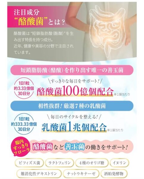 ・タンパク質の摂取やプロテイン服用と合わせると悪玉菌が増えるので、腸活目的で、⑨生きたまま腸に届く耐酸性カプセル、1袋中に短鎖脂肪酸を作り出す酪酸菌100億個・乳酸菌1兆個・厳選7種の乳酸菌、4種のオリゴ糖、ビフィズス菌、ラクトフェリン、ナットウキナーゼ、ガゼリ菌、その他厳選サポート成分を配合した腸活サプリを購入して、1日1回 1カプセル 朝食直後に服用します。