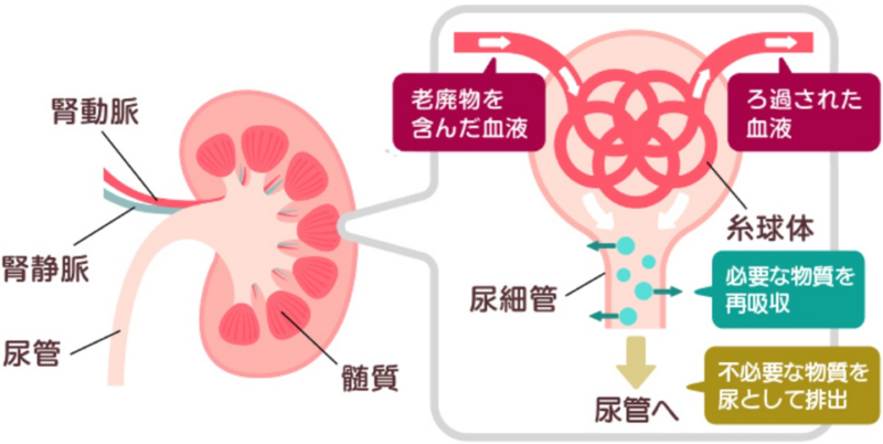 その中の「糸球体」で血液がろ過され、「尿細管」で必要な成分が再吸収されます。
