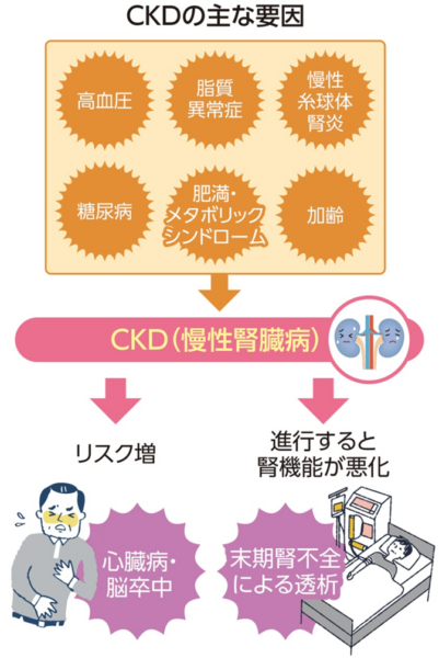 慢性腎臓病(CKD)が進行すると、人工透析や腎移植が必要になるだけでなく、心筋梗塞や脳卒中といった命に関わる病気のリスクも高まります。