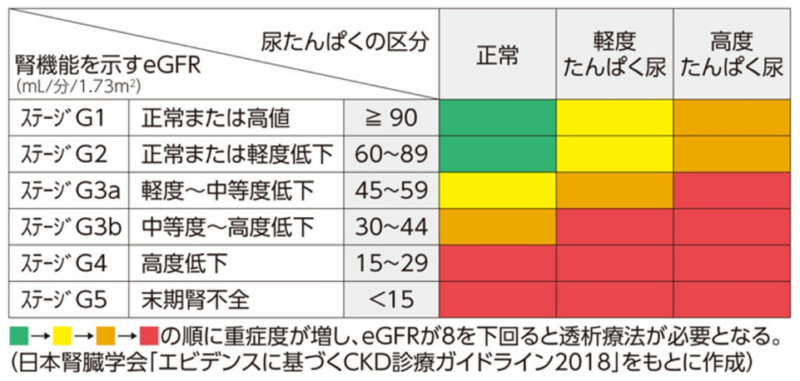 この2つ(eGFR+尿たんぱく)を組み合わせることで、CKDの重症度が評価されます。
