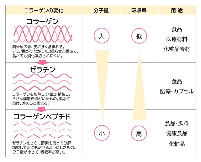 ①低分子コラーゲンペプチドの製品は沢山あります。骨や関節には1日10g(10,000mg)、肌には1日5g(5,000mg)を目安に、コラーゲンペプチドを4週間以上摂取すれば、肌のツヤ・ハリ、関節の健康に役立つと、様々な研究で証明されています。また、低分子コラーゲンペプチドは、血圧降下、免疫寛容、血栓抑制など、多様な機能を持つ機能性ペプチドとして働きます。
