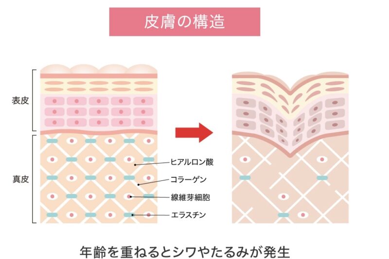 肌は、大きく分けて「表皮」「真皮」「皮下組織」という3つの層で構成されています。肌のハリを支えているのが「真皮層」にあるコラーゲン、エラスチン、ヒアルロン酸といった成分です。「コラーゲン」は、肌の基盤となる繊維です。「エラスチン」は、コラーゲンをゴムのようにしなやかに支える成分です。そして「ヒアルロン酸」は、水分を抱え込み潤いを保ち、肌をしっとりとしてくれるクッションの役割を担います。
