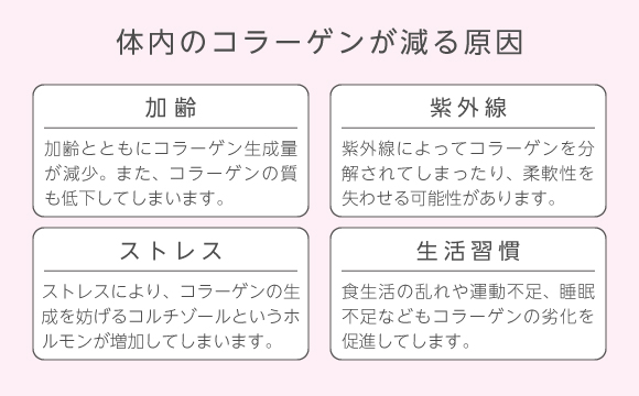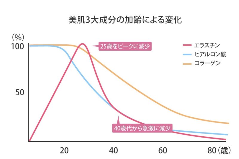 40歳を過ぎると生成力も大幅に低下します。更に、紫外線や乾燥、大気汚染といった「外的ダメージ」や、ストレスや睡眠不足、偏った食生活などの「生活習慣の乱れ」も、肌の老化を加速させる原因となります。