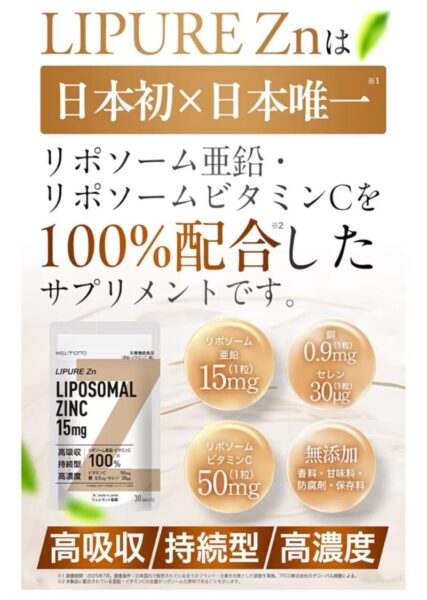 ⑥亜鉛(Zn)は、皮膚や粘膜の健康維持や抗酸化作用などに必須です。ウェルモット製薬の「LIPURE Zn」はリポソーム化した亜鉛15mgで高吸収型です。特に亜鉛は食事だけでは摂りにくい微量元素です。
